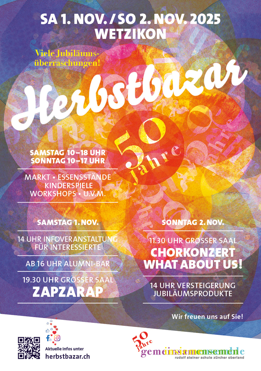 Immer am ersten Novemberwochenende findet der Herbstbazar der Rudolf Steiner Schule in Wetzikon statt. Auf dem bunten Markt lassen sich vielfältige Produkte entdecken, die mit viel Liebe und Handarbeit von den Schuleltern und den Kindern hergestellt werden. Wunderschöne Blumenkränze, frische Zöpfe und Brote, aromatisch Eingemachtes, robustes Holzspielzeug, Bücher, Adventskalender, Filzzwerge, wundersame Mineralien, formschöne Keramik, liebliche Puppen, mechanische Holzbausätze, kreative Textilien oder hochwertige Second-Hand-Kleider, Kerzen, pflegende Naturseifen, filigrane Wollkostbarkeiten und vieles mehr gibt es hier zu entdecken. Jedes Jahr gibt es neue Produkte und Vieles davon gibt es nur jeweils an einem Bazar zu finden – deshalb lohnt es sich, jedes Jahr vorbeizuschauen, denn für Abwechslung ist gesorgt.